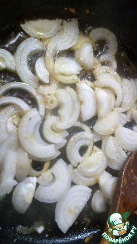 Затем в этом же масле пережарить лук, если мало ещё добавить масла. Так же готовому луку дать стечь от лишнего масла!