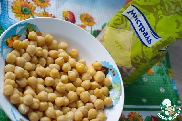 Замочить на ночь стакан нута в холодной воде. Воду после замачивания слить (это снижает музыкальный эффект любых бобовых), залить свежую и отварить до готовности.