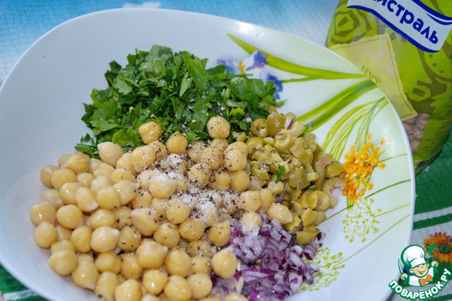 В миске смешать нут, петрушку, лук, оливки, посолить, поперчить, добавить лимонную цедру и сок.