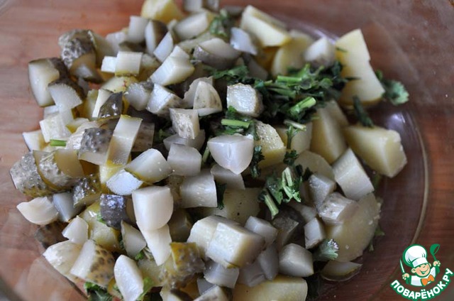 Добавляем к картофелю нарезанные кубиками маринованные корнишоны и мелко нарезанную зелень кинзы.