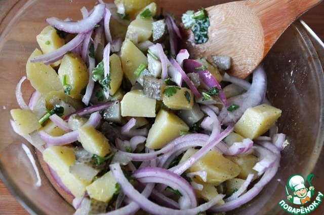 На сервировочную тарелку выкладываем картофель с корнишонами и луком.