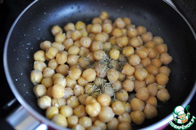 На сковороду наливаем растительное масло, нагреваем, кладём отваренный нут, посыпаем семенами кумина, обжариваем до румяности.