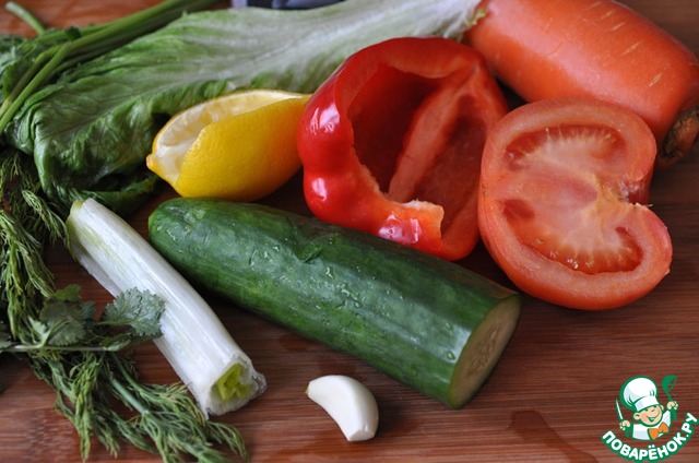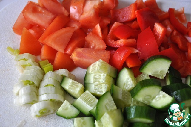 Помидор, болгарский перец и огурец нарезаем кубиками, лук-порей кольцами.