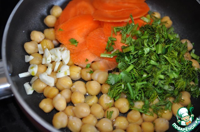 На сковороду наливаем оливковое масло и кладём нут. Прогреваем нут в масле 1 минуту.