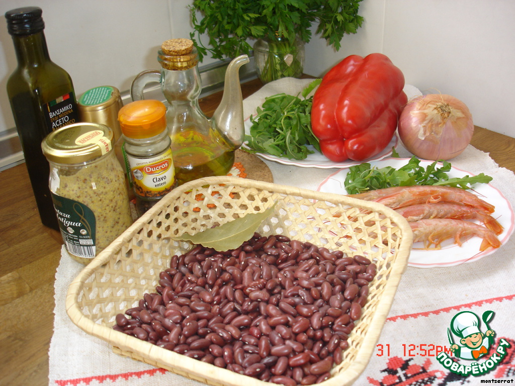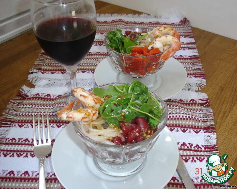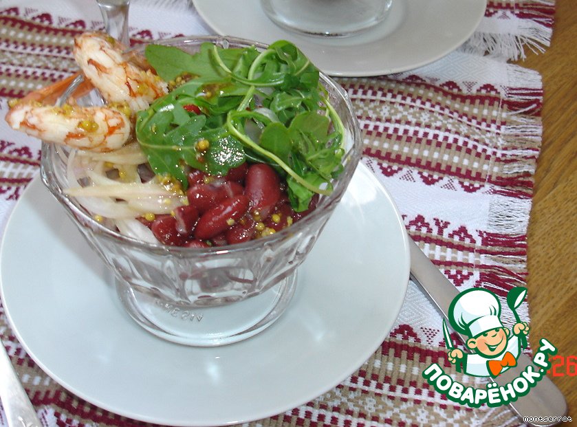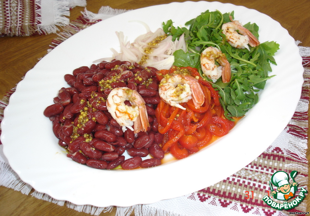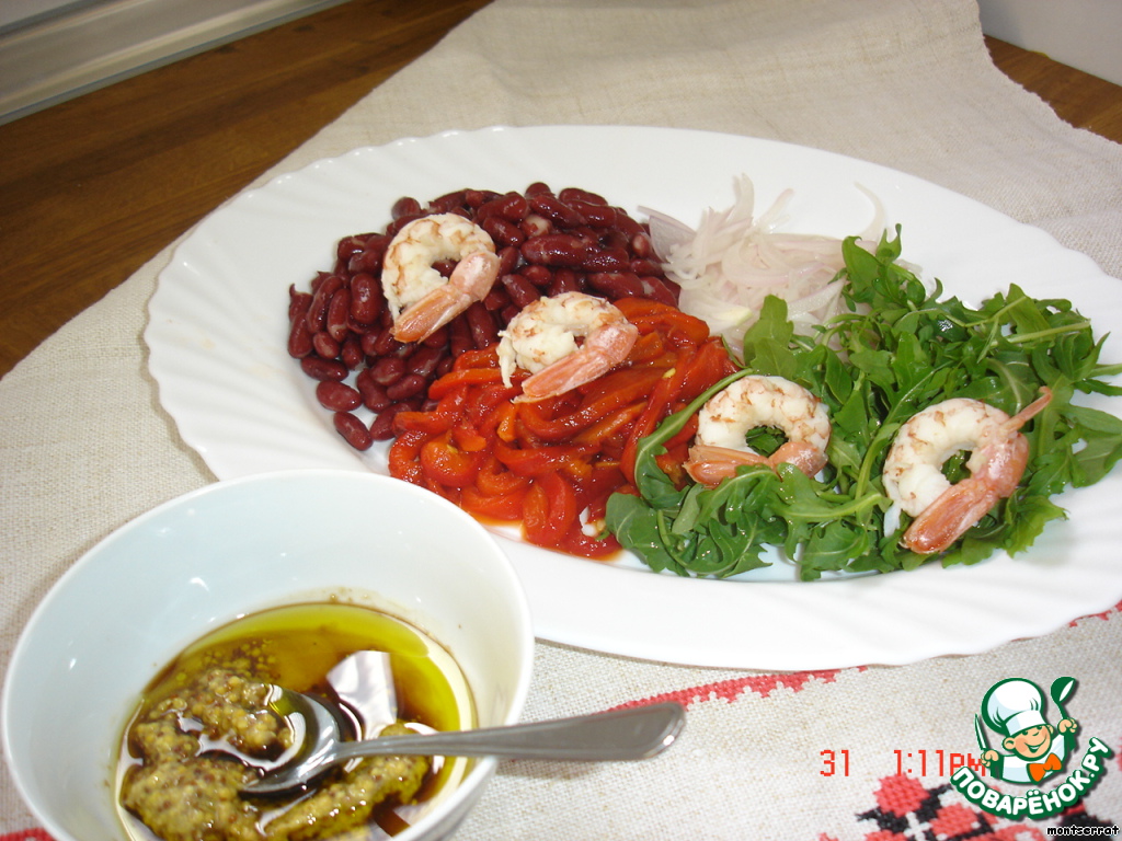 Теплый фасолевый салат с креветками и горчично-медовой поливкой