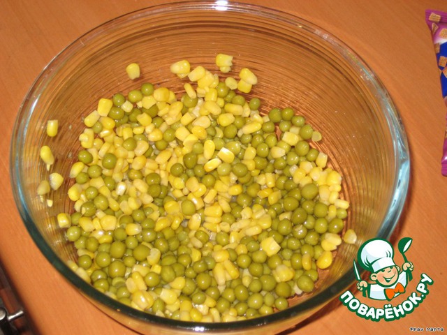 Сок с кукурузы и горошка сливаем, все высыпаем в салатник.