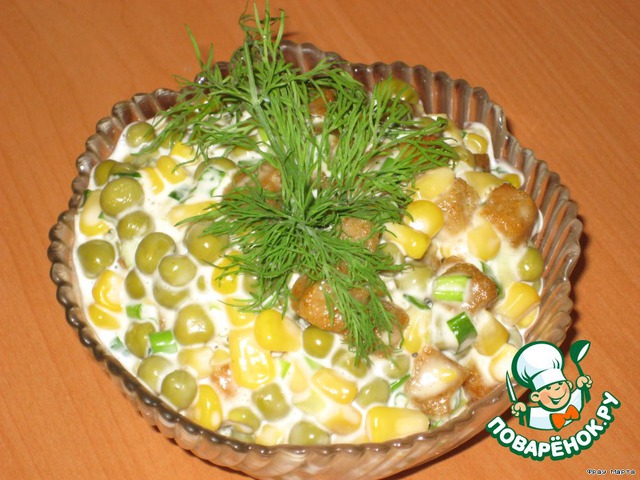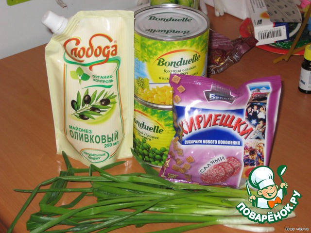 Лук добавляем к кукурузе и горошку, туда же 2 пачки "кириешек", все заправляем майонезом и все!