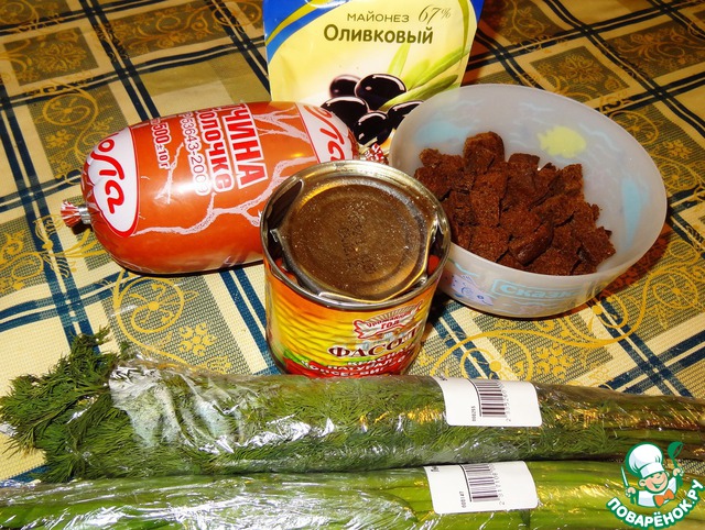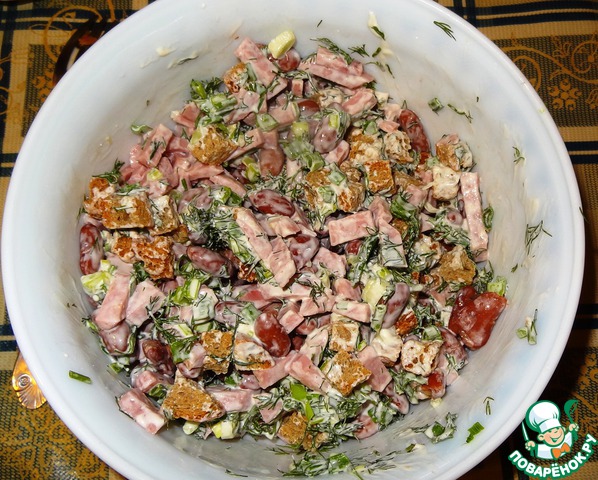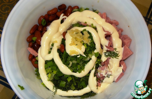 Фасоль промываем, ветчину режем кубиками, зелень меленько шинкуем, чеснок через пресс и все это чудо в салатник, заправляем майонезом.