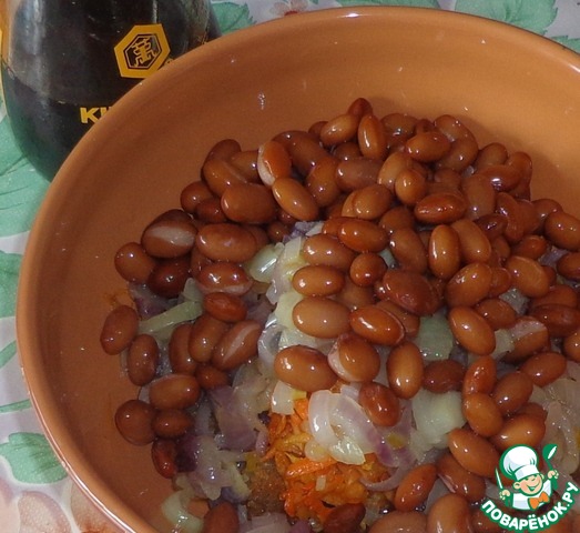 Добавляем к моркови и сухарикам лук. Высыпаем фасоль. Добавляем соевый соус Киккоман. Перемешиваем салат и в теплом виде подаем к столу.