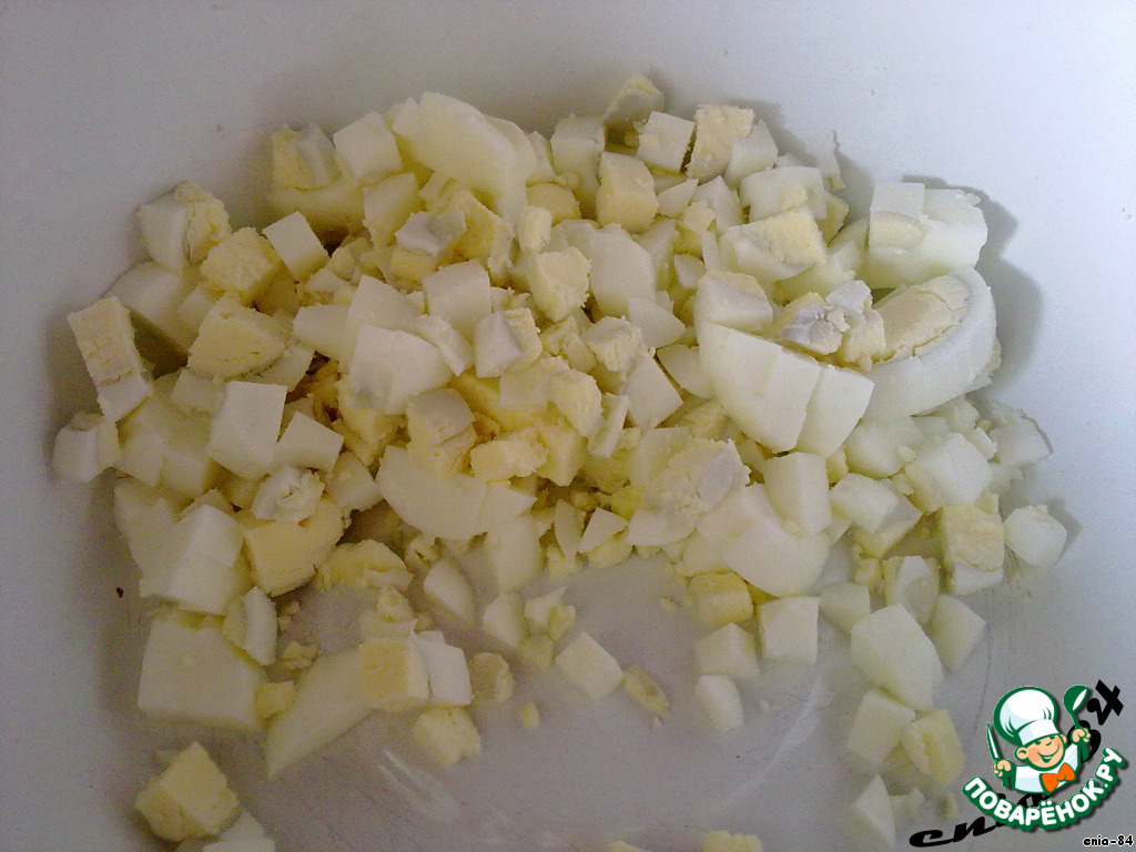 Яйцо (предварительно сваренное) нарезать кубиками.