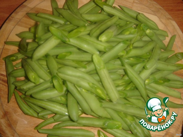 Стручки фасоли очистить от стеблей и боковых жилок, нарезать длинными кусочками и отварить в кипящей подсоленной воде (можно с ложкой уксуса).