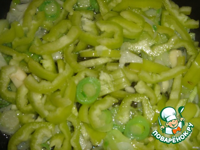 На растительном масле слегка обжарить лук-порей с чесноком, добавить порезанный соломкой болгарский перец и перец чили, освобожденный от семечек и нарезанный соломкой. И вместе слегка обжарить.