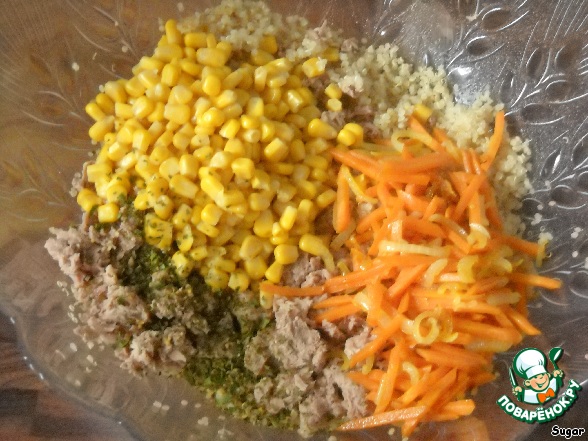 Смешать все ингредиенты, посолить, поперчить. Заправить соусом. Можно добавить зелень (у меня не было, только сухая смесь петрушки и укропа).