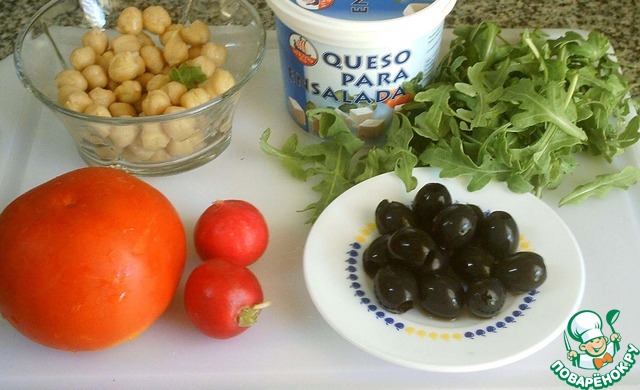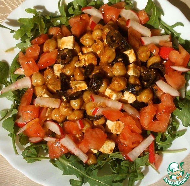 Рукколу выложить на блюдо, посолить, поперчить и выложить сверху нут. Вокруг распределить соус из редиски и помидор.