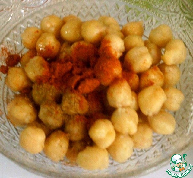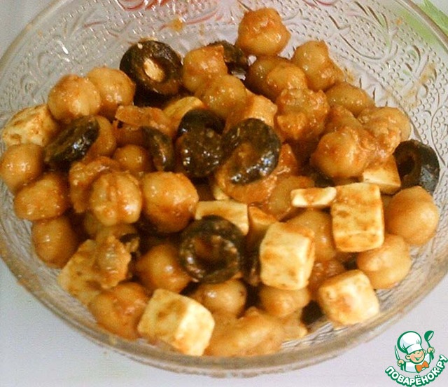 Часто остается отваренный нут после приготовления различных блюд, тогда его можно использовать для салата. Если же нет, то нут замочить предварительно, можно на ночь. Отварить до готовности, минут 40, перед окончанием варки посолить. Добавить паприку и немного зиры. Добавить масло, приправы.