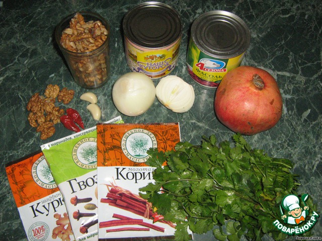 В орехи добавляем лук, чеснок, кинзу, шафран, соль (по желанию можно добавить стручковый перец) - перемешиваем.
