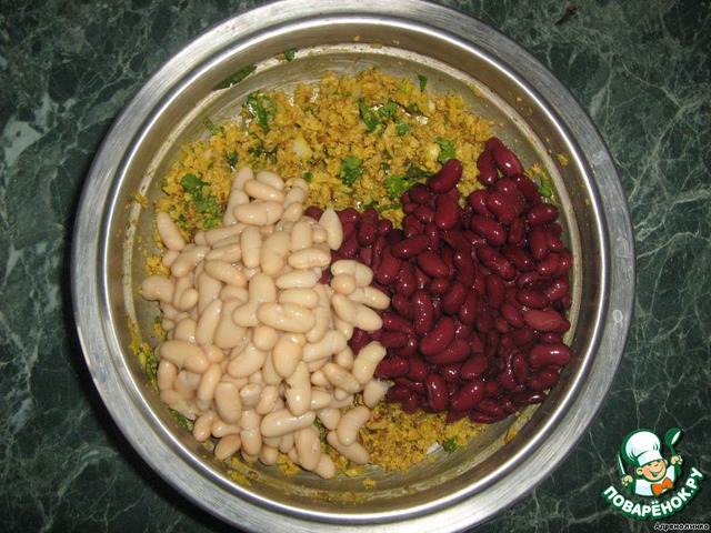 Соединяем всё с фасолью и хорошо перемешиваем.