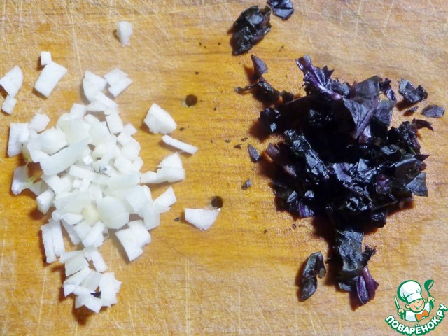 Делаем заправку: чеснок и базилик заливаем оливковым маслом, бальзамическим уксусом. Солим, перчим и все перемешиваем.