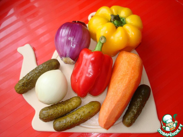 Подготавливаем овощи - перец красный и желтый, морковь, лук белый и красный, маринованные огурчики.