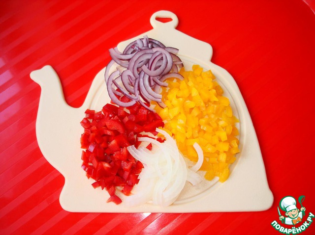 Выкладываю белый лук на черную фасоль, красный лук на белую фасоль, между ними желтый и красный перец.