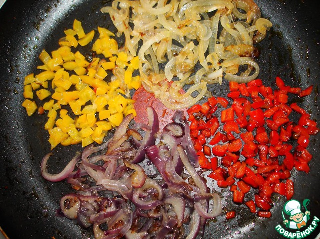 Как только фасоль сварится, очень быстро обжариваем перец и лук.