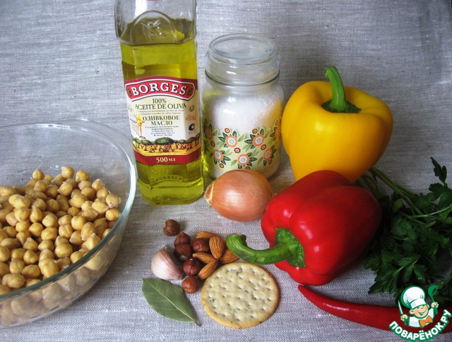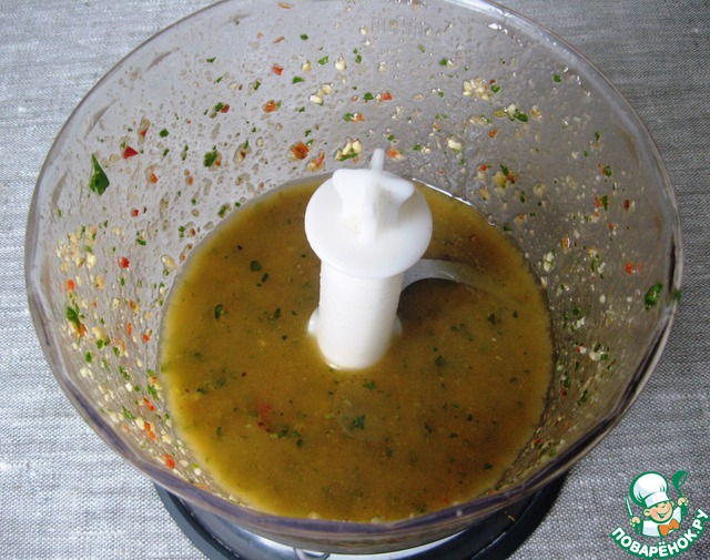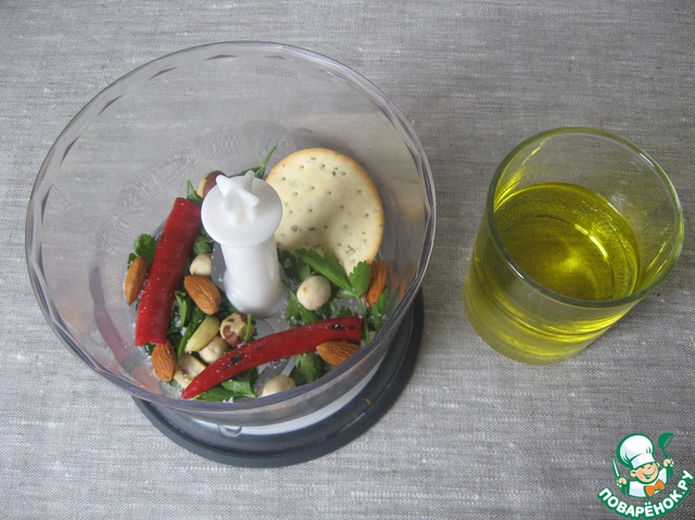 Дальше по рецепту все ингредиенты для пикады нужно растереть в ступке, но у меня её, к сожалению, нет. И я воспользовалась блендером. Крекер, листики с двух веточек петрушки, щепотку крупной соли, обжаренные орехи, чеснок и перец чили складываем в блендер и, постепенно добавляя оливковое масло, доводим до состояния пасты.