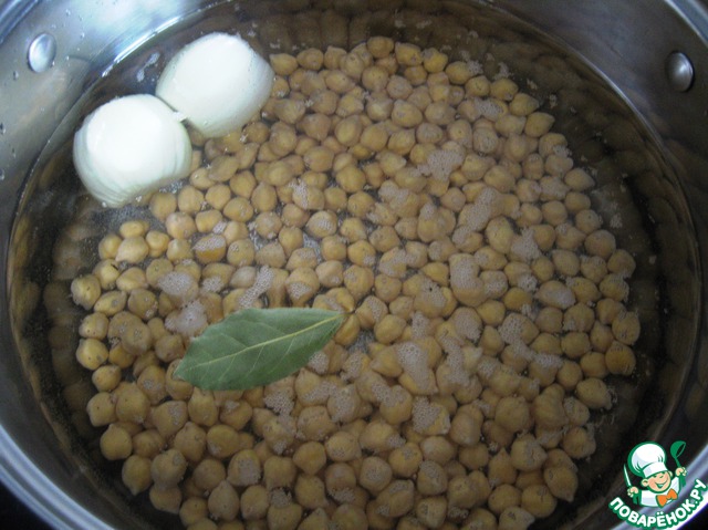 Нут заливаем большим количеством холодной воды, добавляем лавровый лист, луковицу, разрезанную пополам, и ставим на максимальный огонь, доводим до кипения, убавляем огонь до среднего и варим примерно 40-60 минут, до мягкости. Посолить в конце варки.