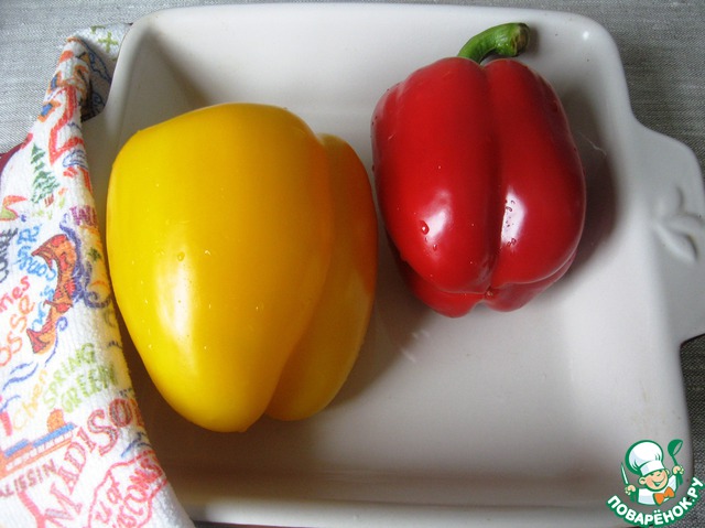Перемешиваем. Перцы очищаем от шкурки и семян и режем соломкой.
