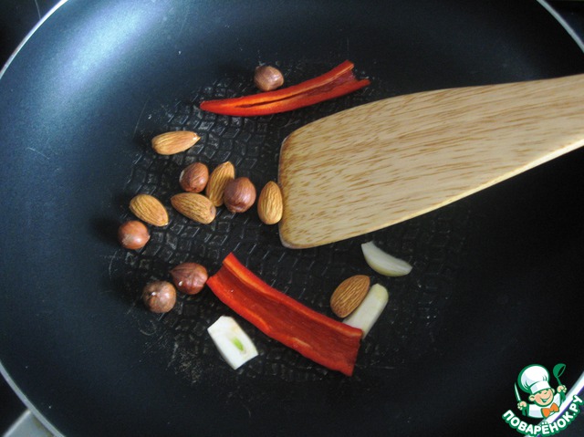 Начинаем приготовление пикады. Немного обжариваем на сухой сковороде чеснок, половинку перца чили (можно брать сушеный) и орехи.