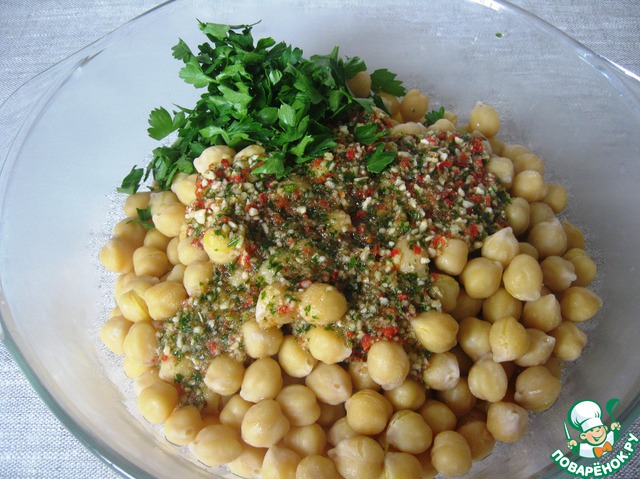 Заправляем сваренный нут пикадой и добавляем пару веточек рубленной петрушки.