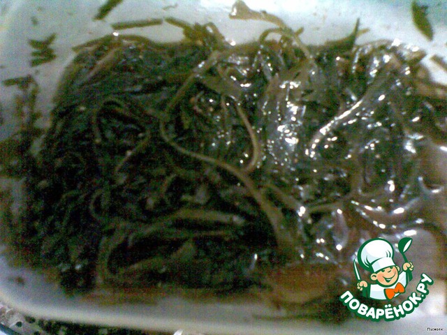 теперь о морской капусте: готовлю как обычно - ошпариваю кипятком, даю постоять 30 мин, промываю в холодной воде, затем заправляю соевым соусом и пряностями (бадьян)