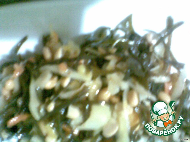| продолжаю серию салатов с морской капусткой. вот еще одно творение. Использовала соевые бобы, получилось очень необычно и так вкусноооооо!!! |
