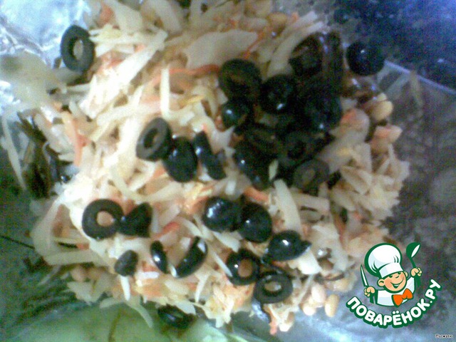 готовую сою выложить в глубокую посуду, добавить к ней морскую капусту, квашенную капусту. порезать колечками маслинки и все заправить прокаленным маслом