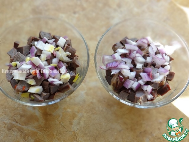 Желудки порезать кубиками, выложить в салатники;