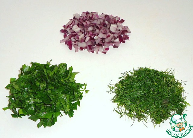 Красный лук, зелень петрушки и укропа мелко нарезать.