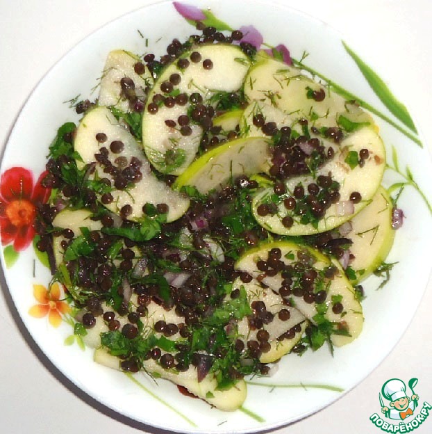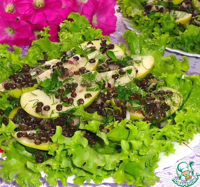 | Очень простой в приготовлении салат из чечевицы с зелёным яблоком, красным луком и зеленью. |