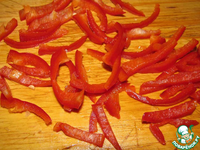 Перец нарезать соломкой. Лучше, если будет разноцветный, у меня был только красный.