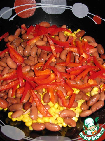 К луку (маринад оставить в салате!) добавить перец, кукурузу и фасоль. Перемешать.