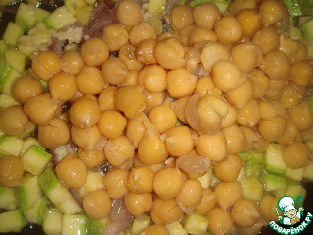 Зубчики чеснока очистить и мелко изрубить, выложить на сковородку к луку с кабачком, добавить нут и прогреть 2 минуты.