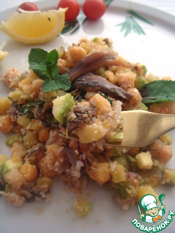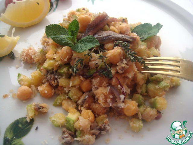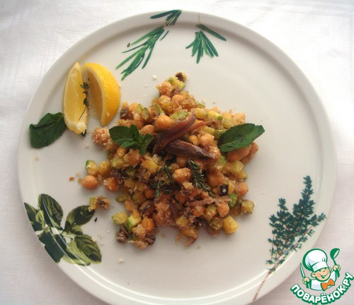 Закуска из нута с чесноком, анчоусами, молодым кабачком и красным луком