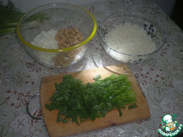 Теперь очередь риса и зеленого лука. Лук режем не очень мелко, чтоб он чувствовался в салате.