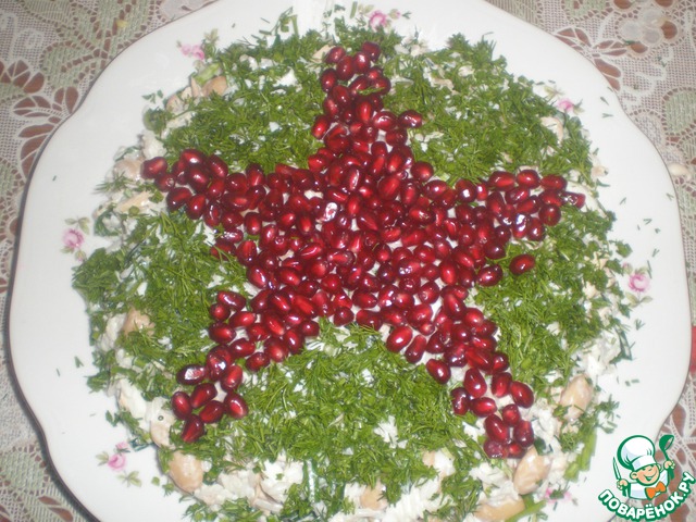 Добавляем наши приправы, перца и кориандра побольше. Заправляем майонезом, выкладываем на блюдо. Украшаем зеленью и зернами граната.