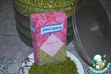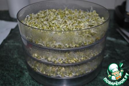 А это фотографии как я проращиваю маш. Поскольку приспособление имеет 3 этажа, то одновременно можно сделать проростки различных злаков и бобовых.