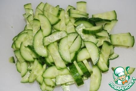 Нарезать свежий огурчик небольшими тонкими кусочками.