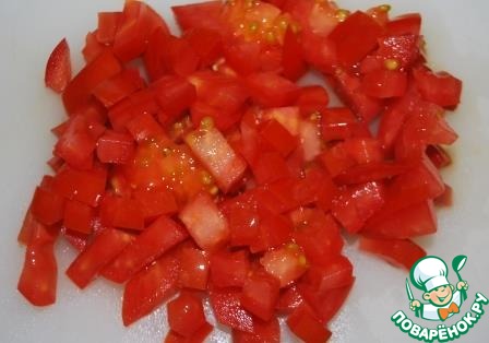 Помидоры тоже нарезать небольшими кусочками. Если они слишком водянистые (а с магазинными это случается частенько), то удалить семена и жидкость.