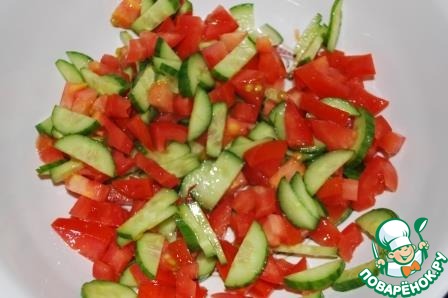 Смешать огурцы и помидоры и отставить в сторонку. Ни в коем случае не солить!