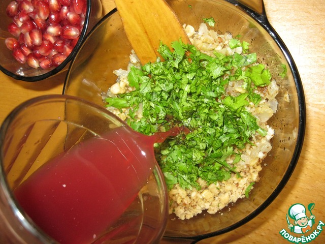 Влить сок в орехово-чесночную массу с луком. Добавить кориандр и хмели-сунели.