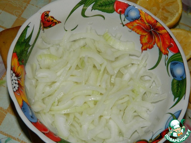 Лук нарезать, промыть в холодной проточной воде. Выжать сок из лимона и замариновать лук минут на 10.