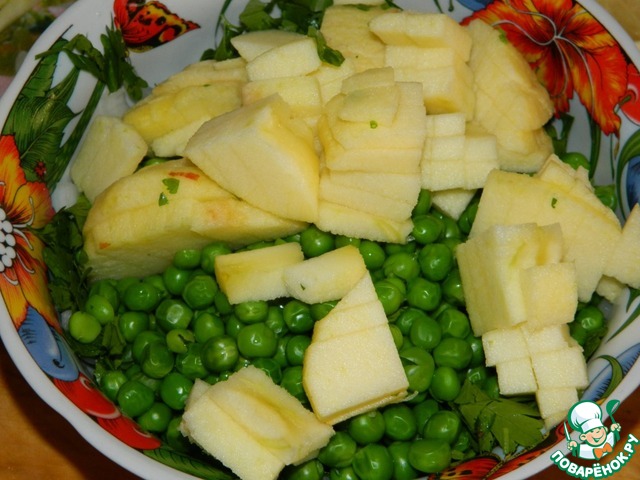 Нарезать петрушку и яблоки. Соединить с горохом и луком. Посолить по вкусу и заправить растительным маслом. Перемешать.