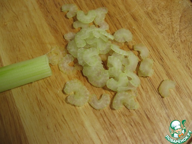 Сельдерей почистим от верхней нежевабельной пленочки. Удобно для этого использовать картофелечистку. Затем нарежем тоненькими ломтиками.